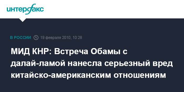 Москва. 19 февраля. INTERFAX.RU - Встречи президента США Барака Обамы и госсекретаря США Хилари Клинтон с далай-ламой 18 февраля явилась вмешательством во внутренние дела КНР и нанесла серьезный китайско- американским отношениям, заявил в пятницу официальный представитель МИД КНР Ма Чжаосюй.