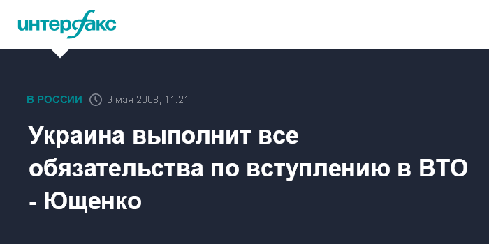 Киев. 9 мая. ИНТЕРФАКС-УКРАИНА - Президент Украины Виктор Ющенко в ходе телефонного разговора с генеральным директором Всемирной торговой организации Паскалем Лами заявил, что Украина надлежащим образом выполнит все обязательства, предусмотренные протоколом о вступлении в организацию.