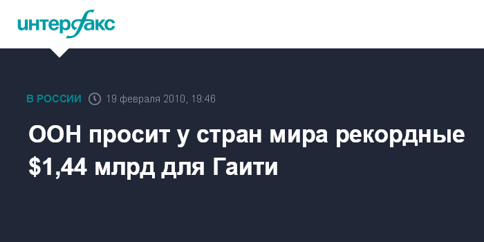 Лондон. 19 февраля. INTERFAX.RU - ООН обратилась к международному сообществу с призывом увеличить количество выделяемых для восстановления Гаити средств до $1,44 млрд, что является рекордом для подобных случаев, сообщает в пятницу BBC.