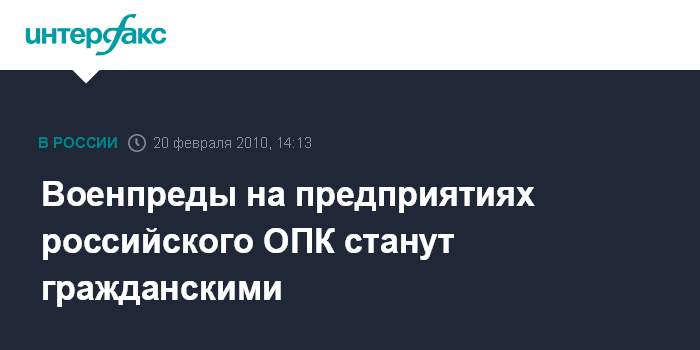 Москва. 20 февраля. INTERFAX.RU - Военные представительства на предприятиях оборонно-промышленного комплекса (ОПК) выведут из состава Вооруженных сил, а военпреды станут гражданскими, сообщил в субботу замминистра обороны РФ Владимир Поповкин. "Принято решение, что военные представительства выведут из вооруженных сил. Начнется также процесс "огражданивания" военных представителей", - сказал В.Поповкин в эфире радиостанции "Эхо Москвы".