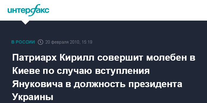 Москва. 20 февраля. INTERFAX.RU - По приглашению избранного президента Украины Виктора Януковича патриарх Кирилл на следующей неделе прибудет в Киев и возглавит в Киево-Печерской лавре молебен перед официальным вступлением В.Януковича в должность главы украинского государства. "В молебне, который будет совершен 25 февраля, также примет участие митрополит Киевский и всея Украины Владимир", - сообщил корреспонденту "Интерфакс-Религия" (www.interfax-religion.ru) в субботу замглавы Отдела внешних церковных связей Московского патриархата протоиерей Николай Балашов.