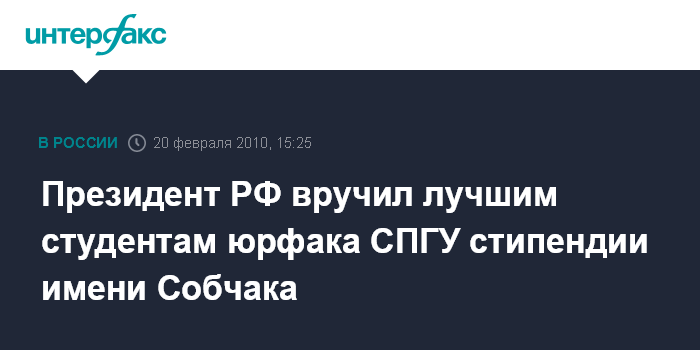 Москва. 20 февраля. INTERFAX.RU - Президент РФ Дмитрий Медведев в субботу вручил троим студентам четвертого курса юридического факультета Петербургского госуниверситета документы на получение стипендий имени первого мэра Петербурга Анатолия Собчака. Как передал корреспондент "Интерфакса", именные стипендии получили Антон Зубарский, Анна Иванова и Владислав Савиных.