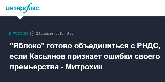 Москва. 20 февраля. INTERFAX.RU - Говорить об объединении партии "Яблоко" с Российским народно-демократическим союзом (РНДС) можно будет лишь после того, как лидер этой организации Михаил Касьянов признает свои ошибки в период его работы в правительстве, заявил лидер "Яблока" Сергей Митрохин.