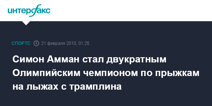 Москва. 21 февраля. INTERFAX.RU - Швейцарец Симон Амман стал двукратным Олимпийским чемпионом Ванкувера. В субботу, 20 февраля, Амман выиграл соревнования по прыжкам на лыжах с 120-метрового трамплина. Первую золотую медаль Ванкувера он выиграл в прыжках с 90-метрового трамплина. Таким образом, 28-летний летающий лыжник повторил свое достижение Игр в Солт-Лейк Сити и стал четырехкратным олимпийским чемпионом. Серебряную медаль в К-120 завоевал поляк Адам Малыш. Бронза у Грегора Шлиренцауера из Австрии.