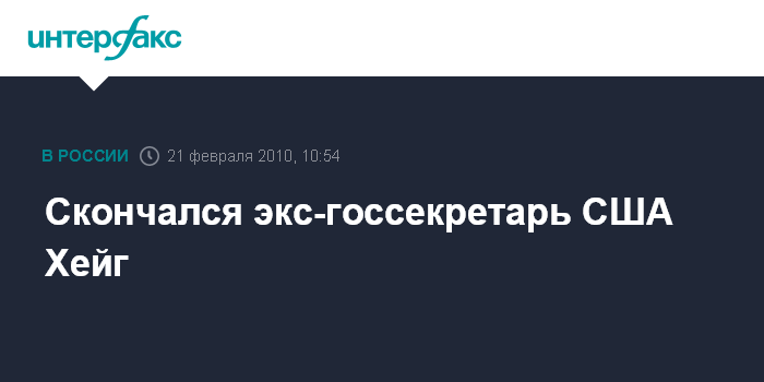 Вашингтон. 21 февраля. INTERFAX.RU - Бывший государственный секретарь США и советник трех американских президентов Александер Хейг скончался в возрасте 85 лет в больнице имени Джона Хопкинса в американском городе Балтиморе, сообщает в воскресенье американский телеканал "Скай ньюс". А.Хейг пришел на работу в американскую администрацию при президенте Ричарде Никсоне, затем продолжил работать с Джеральдом Фордом и Рональдом Рейганом.