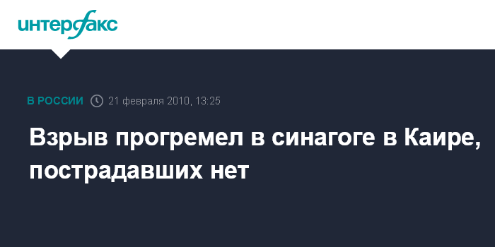 Иерусалим. 19 февраля. INTERFAX.RU - Маломощное самодельное взрывное устройство сработало в воскресенье утром в основной синагоге Каира, сообщает интернет-сайт израильской газеты "Гаарец". По данным издания, чемодан, в котором находились баллоны с бензином и серная кислота, был брошен внутрь помещения через окно. Возник небольшой пожар, никто не пострадал. Начато расследование.