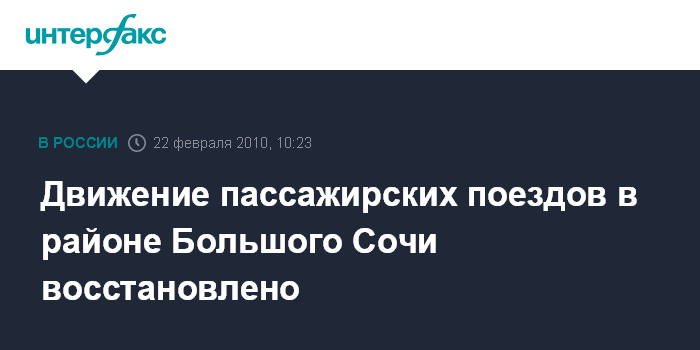"Движение поездов полностью восстановлено в 9:14 мск", - сказал агентству "Интерфакс-Юг" заместитель руководителя главного управления МЧС РФ по Краснодарскому краю - руководитель управления МЧС по Сочи Николай Шустов.