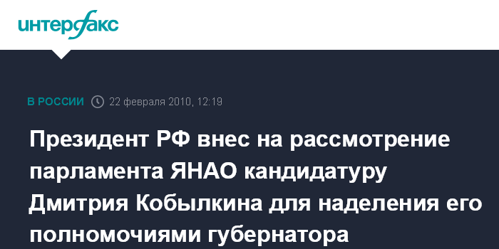 Москва. 22 февраля. INTERFAX.RU - Президент России Дмитрий Медведев внес на рассмотрение Законодательного Собрания Ямало-Ненецкого автономного округа кандидатуру Дмитрия Кобылкина для наделения его полномочиями губернатора ЯНАО, сообщает в понедельник пресс-служба Кремля.