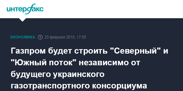 Москва. 23 февраля. INTERFAX.RU – "Газпром" не отказывается от строительства газопроводов "Северный поток" и "Южный поток" не смотря на предложения нового президента Украины вернуться к вопросу о создании консорциума по управлению и развитию газотранспортной системой (ГТС) Украины, заявил телеканалу Russia Today зампред правления "Газпрома" Александр Медведев.