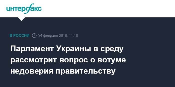 Москва. 24 февраля. INTERFAX.RU - Верховная Рада Украины в среду может рассмотреть вопрос о вотуме недоверия действующему Кабинету министров. Об этом заявила премьер-министр Юлия Тимошенко на открытии заседания правительства.