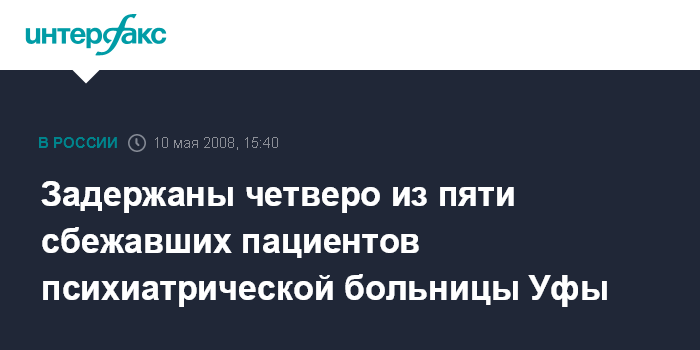Уфа. 10 мая. ИНТЕРФАКС-ПОВОЛЖЬЕ - В Уфе задержали четверых из пяти сбежавших в субботу утром из республиканской психиатрической больницы № 1.