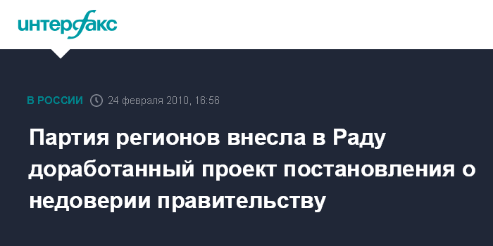 Москва. 24 февраля. INTERFAX.RU - Народные депутаты от Партии регионов зарегистрировали в Верховной Раде проект постановления об ответственности Кабинета министров. Проект постановления предполагает вынесение вотума недоверия правительству.