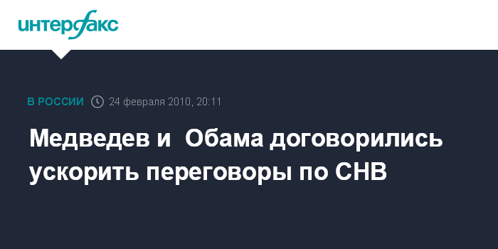 Москва. 24 февраля. INTERFAX.RU - Президенты России и США Дмитрий Медведев и Барак Обама в ходе телефонного разговора отметили важность скорейшего завершения переговоров по новому договору об СНВ, сообщили в среду "Интерфаксу" в пресс-службе Кремля.