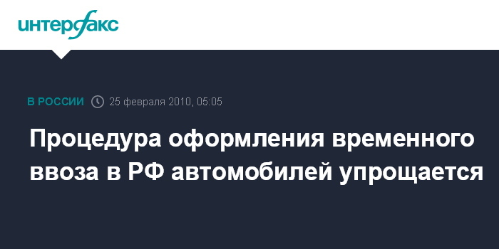 Как говорится в сообщении Федеральной таможенной службы (ФТС), с таможенных органов снимается обязанность регистрации транспортных средств, зарегистрированных в других странах и временно находящихся на территории РФ. Таким образом, для временного ввоза автомобилей с 25 февраля физическим лицам нет необходимости оформлять удостоверение ввоза транспортного средства (УВТС). "Это упростит таможенное оформление и даст возможность проводить его в более сжатые сроки", - говорится в сообщении службы.