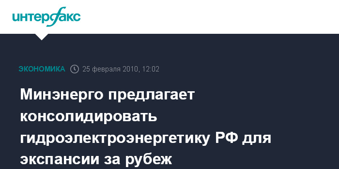 Москва. 25 февраля. INTERFAX.RU - Минэнерго РФ предлагает консолидировать гидроэлектроэнергетику РФ для дальнейшей экспансии за рубеж.