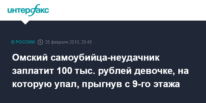 Новосибирск. 25 февраля. INTERFAX.RU - Октябрьский районный суд Омска обязал выплатить более 100 тыс. рублей местного жителя, который, пытаясь покончить с собой, выпрыгнул из окна 9-го этажа и случайно упал на 7-летнюю девочку.