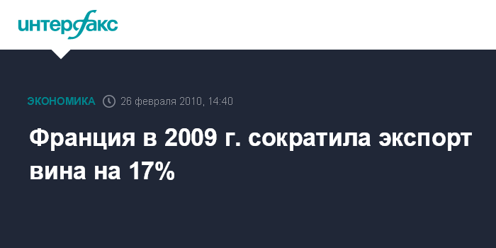 Париж. 26 февраля. INTERFAX.RU - Франция в 2009 году сократила экспорт вина на 17%, сообщила Федерация экспортеров вина.