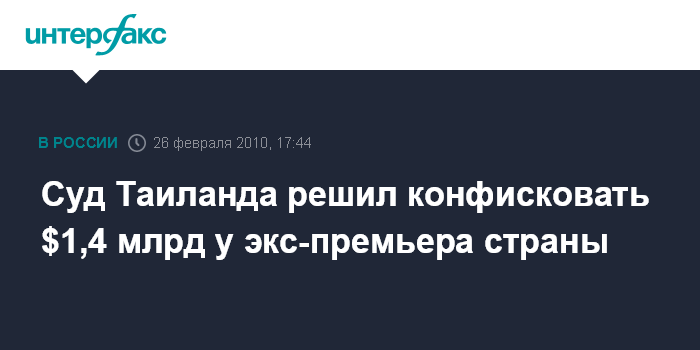 Бангкок. 26 февраля. INTERFAX.RU - Верховный суд Таиланда объявил в пятницу о решении конфисковать примерно $1,4 млрд у бывшего премьер-министра страны Таксина Чинавата, сообщает агентство ЭФЭ.