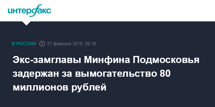 Экс-замглавы Минфина Подмосковья задержан за вымогательство 80 миллионов рублей