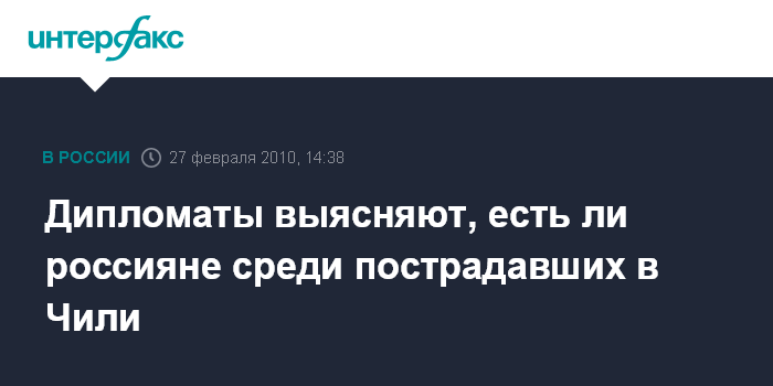 Москва. 27 февраля. INTERFAX.RU - Сотрудники российских загранучреждений в Чили не пострадали в результате землетрясения, посольство РФ в Сантьяго устанавливает, могли ли оказаться среди пострадавших соотечественники.