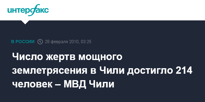 Москва. 28 февраля. ИНТЕРФАКС - Число жертв мощного землетрясения в Чили (магнитуда 8,8) достигло 214 человек, сообщил глава МВД Чили в воскресенье ночью.