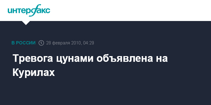 Южно-Сахалинск. 28 февраля. ИНТЕРФАКС - ДАЛЬНИЙ ВОСТОК - Тревога цунами объявлена в 10:47 по сахалинскому времени (3:47 мск) на всех заселенных Курильских островах, сообщила агентству "Интерфакс - Дальний Восток" руководитель Сахалинского центра цунами управления Сахалингидрометслужбы Татьяна Ивельская.