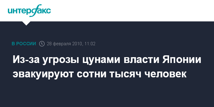 Токио. 28 февраля. INTERFAX.RU - В связи с угрозой цунами власти Японии решили эвакуировать 320 тыс. жителей из прибрежных районов на севере страны, сообщают в воскресенье местные СМИ. Эвакуация проводится на территории префектур Аомори, Иватэ и Мияги. До этих провинций уже добрались несколько волн цунами, наиболее высокая из которых достигала 120 сантиметров. По прогнозам специалистов, в северной части страны возможно цунами высотой до трех метров.