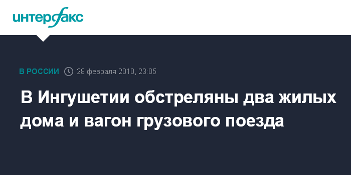 Назрань. 28 февраля. ИНТЕРФАКС-ЮГ - В Ингушетии в воскресенье вечером неизвестные обстреляли из гранатомета два частных домовладения и вагон железнодорожного состава, сообщает представитель МВД Ингушетии.