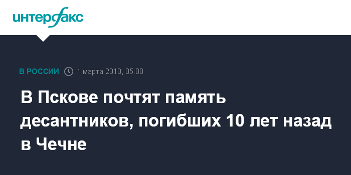 Псков. 1 марта. ИНТЕРФАКС СЕВЕРО-ЗАПАД - В Пскове в понедельник пройдет День памяти десантников 6-й роты 104 полка 76-й десантно-штурмовой дивизии.