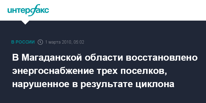 Хабаровск. 1 марта. ИНТЕРФАКС - ДАЛЬНИЙ ВОСТОК - В Ольском районе Магаданской области ликвидирована энергоавария, оставившая без электричества почти полторы тысячи жителей поселков.
