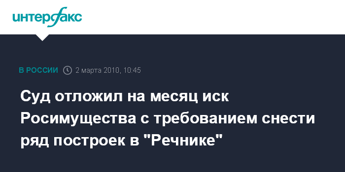 Москва. 2 марта. INTERFAX.RU - Арбитражный суд Москвы во вторник отложил на 2 апреля рассмотрение иска Федерального агентства по управлению государственным имуществом (Росимущество) к садовому некоммерческому партнерству (СНП) "Речник" обязать снести бытовку и здание правления товарищества. Журналистам в суде сообщили, что дело отложено в связи с тем, что Росимущество подало апелляционную жалобу на отложение иска, которое состоялось ранее.
