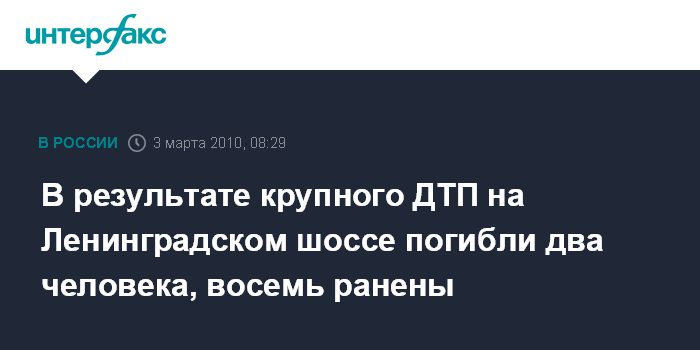 Москва. 3 марта. INTERFAX.RU - В среду утром на Ленинградском шоссе в районе 41-го км произошло ДТП с участием трех грузовых фур и пяти легковых автомобилей, сообщил "Интерфаксу" источник в правоохранительных органах города. По его словам, в результате происшествия два человека погибли, восемь пострадали. Собеседник агентства добавил, что пострадавшие госпитализированы с травмами различной степени тяжести.