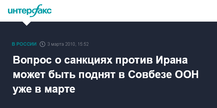 Тегеран/Оттава. 3 марта. INTERFAX.RU - Совет Безопасности ООН может рассмотреть вопрос ужесточения санкций против Ирана уже в марте, сообщает в среду иранский телеканал "Пресс-ТВ" со ссылкой на заявление председательствующего в этом месяце в Совбезе представителя Габона Эманюэля Иссозе-Нгондета.