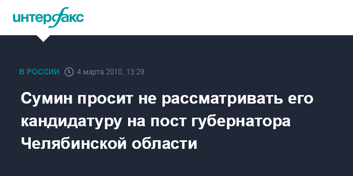 Москва. 4 марта. INTERFAX.RU - Губернатор Челябинской области Петр Сумин обратился с просьбой не рассматривать его кандидатуру на новый срок, сообщает сайт партии "Единая Россия" в четверг. "Губернатор области Петр Сумин обратился к членам рабочей группы с просьбой не рассматривать его кандидатуру, так как он считает, что к управлению регионами должны привлекаться более молодые кадры", - сказал глава высшего совета партии "Единая Россия" Борис Грызлов, которого цитирует сайт "Единой России".