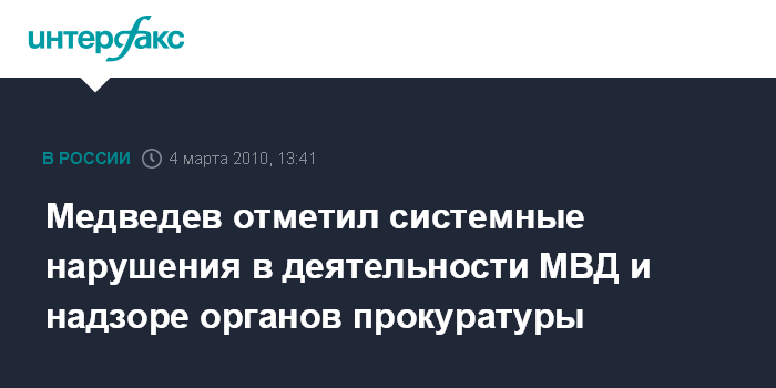 Москва. 4 марта. INTERFAX.RU - Системные нарушения в МВД и надзоре прокуратуры за деятельностью этого ведомства стали причинами его масштабной реформы, заявил президент России Дмитрий Медведев. "На коллегии МВД я объявил о начале масштабной реформы этого ведомства. Необходимость такой реформы назрела давно, но поводом для ее начала, в том числе, конечно, стали получившие значительный общественный резонанс и негативно сказавшиеся на авторитете органов внутренних дел события и преступления", - заявил президент РФ на коллегии Генпрокуратуры в четверг. "Все это свидетельствует о нарушениях в организации как работы самого министерства, так и в осуществлении надзора за его деятельностью со стороны органов прокуратуры", - отметил Медведев.