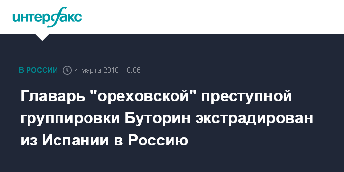 Москва. 4 марта. INTERFAX.RU - Испания выдала России лидера одной из самых "кровавых" в 90-е годы прошлого века "ореховской" преступной группировки Сергея Буторина, сообщил замглавы управления экстрадиций Генпрокуратуры РФ Вадим Яловицкий. "Сегодня Буторин был передан российскому спецконвою и доставлен к месту производства следствия для привлечения к уголовной ответственности на территории России", - сказал Яловицкий в четверг журналистам в Москве. По его словам, Буторин лично обвиняется в совершении более 30 убийств.