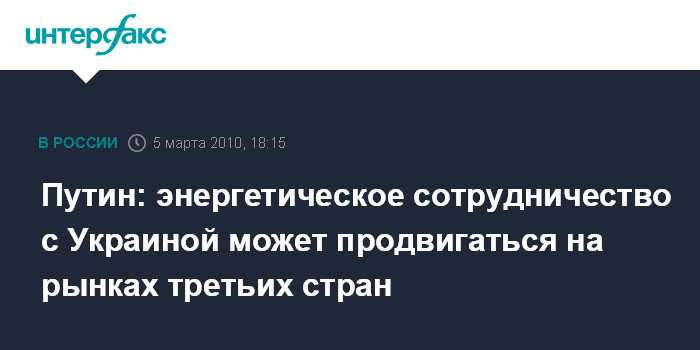 Москва. 5 марта. INTERFAX.RU - Российско-украинское сотрудничество в энергетике может развиваться, в том числе, и на рынках третьих стран, заявил премьер-министр РФ Владимир Путин на встрече с президентом Украины Виктором Януковичем.