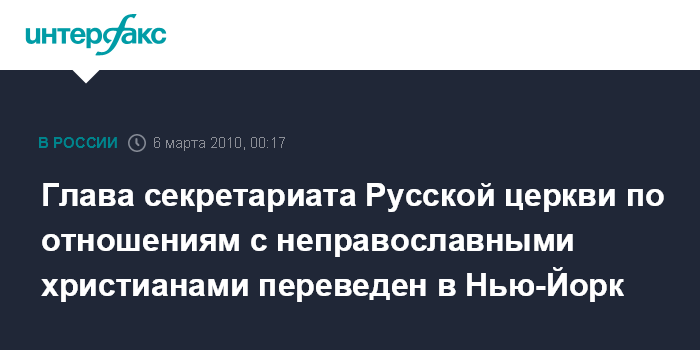 Глава секретариата Русской церкви по отношениям с неправославными христианами переведен в Нью-Йорк