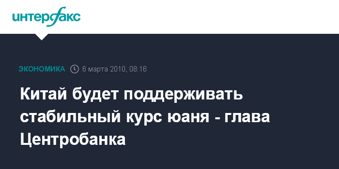 Пекин. 6 марта. ИНТЕРФАКС-КИТАЙ - Китай намерен поддерживать стабильный курс национальной валюты, заявил в субботу на пресс-конференции в рамках проходящей сессии Всекитайского собрания народных представителей (ВСНП, высший орган государственной власти Китая) председатель Народного банка Китая Чжоу Сяочуань.