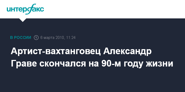"Сегодня пришла скорбная весть. На 90-м году скончался народный артист России Александр Константинович Граве. Вахтанговцы скорбят о невосполнимой утрате и выражают глубокие соболезнования родным и близким", - сказал собеседник агентства.