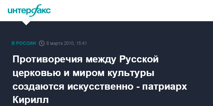 Санкт-Петербург. 6 марта. INTERFAX.RU - Патриарх Московский и всея Руси Кирилл заявил, что Церковь открыта к сотрудничеству с миром культуры, а противоречия между ними создаются искусственно. "В обществе нашем возникают нездоровые и искусственно создаваемые противоречия между Церковью и миром культуры. Эти противоречия будоражат общественное мнение и направлены на ослабление позиции Церкви в нашем обществе", - заявил патриарх, посещая в субботу Александро-Невскую лавру в Петербурге.