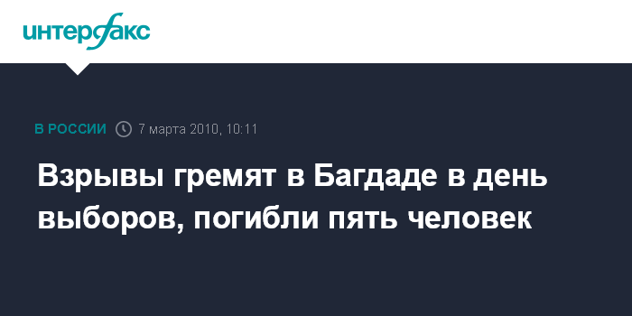 Лондон. 7 марта. INTERFAX.RU - В Багдаде в первые часы после открытия избирательных участков на выборах в парламент Ирака произошли два взрыва, сообщает в воскресенье Би-би-си. В результате первого взрыва четыре человека погибли и восемь ранены, разрушено здание, сообщил источник в министерстве внутренних дел. В результате второго взрыва погиб один человек. В Ираке в воскресенье проходят вторые парламентские выборы со времени падения режима Саддама Хусейна в 2003 году.