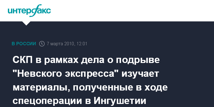 Москва. 7 марта. INTERFAX.RU - Расследование уголовного дела о подрыве поезда "Невский экспресс" в ноябре 2009 года продолжается, следователи изучают материалы, полученные в ходе спецоперации в Ингушетии, сообщил "Интерфаксу" в воскресенье официальный представитель СКП РФ Владимир Маркин.