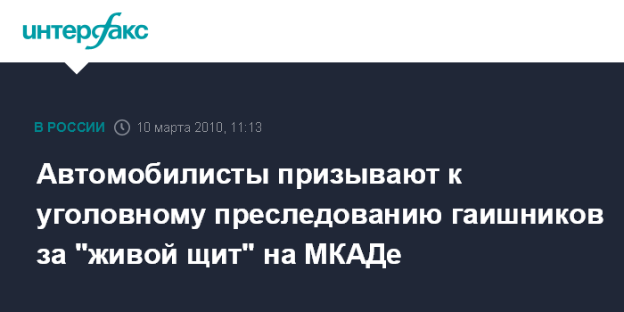 Москва. 10 марта. INTERFAX.RU – Лидеры движений автомобилистов России считают необходимым возбудить уголовные дела в отношении сотрудников ГИБДД, устроивших "живой щит" на Московской кольцевой автодороге.
