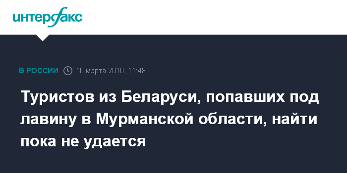 Москва. 10 марта. INTERFAX.RU – Спасатели продолжают поиск четверых туристов из Беларуси, которых во вторник накрыло лавиной в горном массиве Хибины в Мурманской области, сообщили в среду "Интерфаксу" в Главном управлении МЧС по Мурманской области.