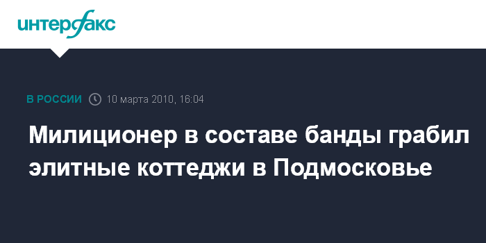 Москва. 10 марта. INTERFAX.RU - В Подмосковье задержана преступная группировка, грабившая элитные дачи, в состав которой входил сотрудник милиции, сообщил в среду "Интерфаксу" источник в правоохранительных органах. По предварительным данным, в Домодедовском районе с начала этого года было обворовано несколько элитных особняков в одном из садовых товариществ. По этим фактам было возбуждено уголовное дело.