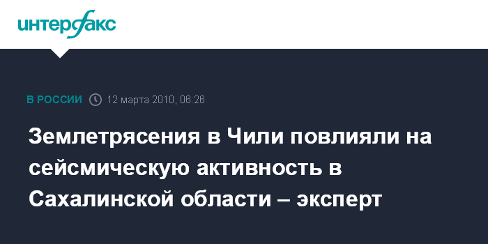 Южно-Сахалинск. 12 марта. ИНТЕРФАКС - ДАЛЬНИЙ ВОСТОК - Сильные землетрясения в Чили способствовали увеличению сейсмической активности в Сахалинской области, сообщил агентству "Интерфакс - Дальний Восток" начальник сейсмостанции "Южно-Сахалинск" Александр Спирин.