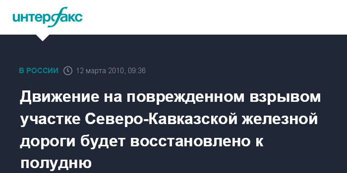 Москва. 12 марта. INTERFAX.RU - Ремонтные бригады приступили к восстановлению поврежденного взрывом полотна железной дороги на окраине Махачкалы, сообщили "Интерфаксу" в пятницу в пресс-службе главного управления МЧС России по Дагестану. "Ремонтники приступили к работе после того, как участок дороги был обследован кинологами и взрывотехниками. Взрывных устройств не обнаружено. Предполагается, что движение будет восстановлено к 12:00", - сообщил представитель пресс-службы ГУ МЧС России по Дагестану.
