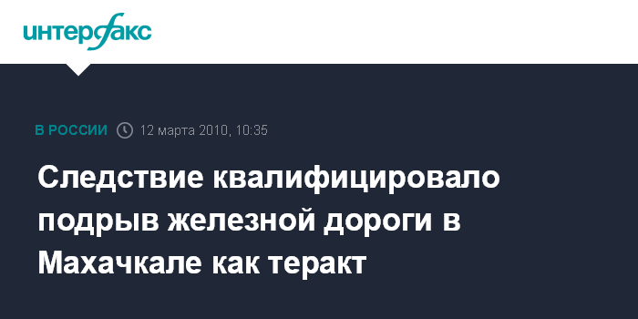 Москва. 12 марта. INTERFAX.RU - Следственным отделом линейного управления внутренних дел на транспорте Махачкалы возбуждено уголовное дело по факту взрыва на железной дороге, произошедшего вечером в четверг, сообщили "Интерфаксу" в пятницу в дежурной части линейного управления. "Дело возбуждено по статьям 205 (террористический акт) и 222 (незаконный оборот оружия и взрывчатых веществ). В настоящее время проводятся первичные следственные мероприятия, идет сбор вещественных доказательств", - сообщил дежурный.