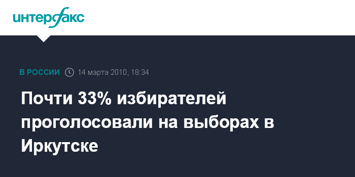 Иркутск. 14 марта. INTERFAX.RU - Явка избирателей на выборах мэра Иркутска по состоянию на 21:30 местного времени (16:30 мск) составила 32,6%, сообщили в воскресенье агентству "Интерфакс-Сибирь" в избирательной комиссии Иркутской области. Как отметил собеседник агентства, в среднем по региону на муниципальных выборах явка составила 35,6% по состоянию на 21:30. Избирательные участки в Иркутске закроются в 22:00 по местному времени. По области избирательные участки будут принимать избирателей до 20:00. На пост мэра Иркутска претендуют три кандидата - заместитель директора ООО "Такота" Виктор Кондрашов (КПРФ), и.о. главы администрации Иркутска Сергей Серебренников ("Единая Россия"), а также пенсионерка Людмила Корякова (самовыдвижение).